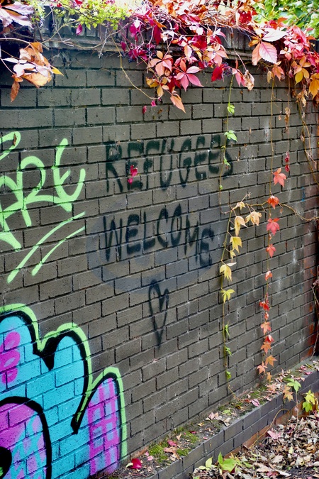Refugees welcome spray painted on a wall by Kings Meadow., Credit:Geoffrey Swaine / Avalon
