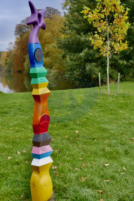 A River Thames Thames Path marker sign painted in rainbow colours to represent Pride which is held in the meadow nearby in the summer months., Credit:Geoffrey Swaine / Avalon