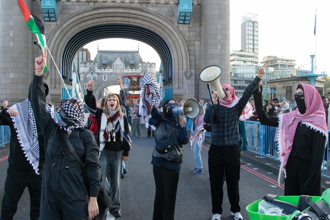 London, UK, 11th October 2025 - Youth Demand Protestors block traffic on Tower Bridge for 15-20 minutes, demanding justice for Palestine, before being arrested by Metropolitan Police under Section Seven of the Public Order act., Credit:Will Colebourne / Avalon