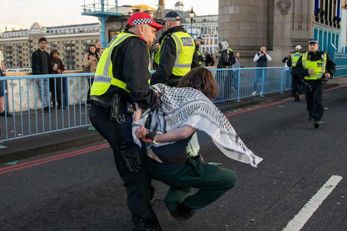 London, UK, 11th October 2025 - Youth Demand Protestors block traffic on Tower Bridge for 15-20 minutes, demanding justice for Palestine, before being arrested by Metropolitan Police under Section Seven of the Public Order act., Credit:Will Colebourne / Avalon