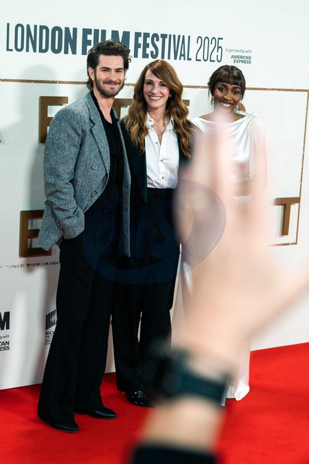 (L-R) Andrew Garfield, Julia Roberts and Ayo Edebiri attend the "After the Hunt" Headline Gala at the 69th BFI London Film Festival at The Royal Festival Hall, Credit:lounis Tiar / Avalon