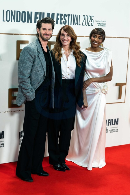 (L-R) Andrew Garfield, Julia Roberts and Ayo Edebiri attend the "After the Hunt" Headline Gala at the 69th BFI London Film Festival at The Royal Festival Hall, Credit:lounis Tiar / Avalon