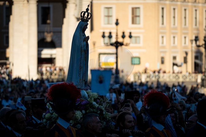 The statue of Our Lady of Fatima is carried to St. Peter's square before the arrival of Pope Leo XIV to preside over a Rosary vigil for peace on the 63rd anniversary of the start of the Second Vatican Council in St. Peter's Square in Vatican City, Vatican, on 11 October 2025., Credit:Stefano Costantino TTL / Avalon