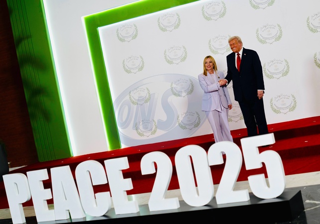 13/10/2025 Sharm el Sheikh, Signing ceremony of the Middle East Peace Plan, pictured is Prime Minister Giorgia Meloni with US President Donald Trump, Credit:Ufficio Stampa / Avalon
