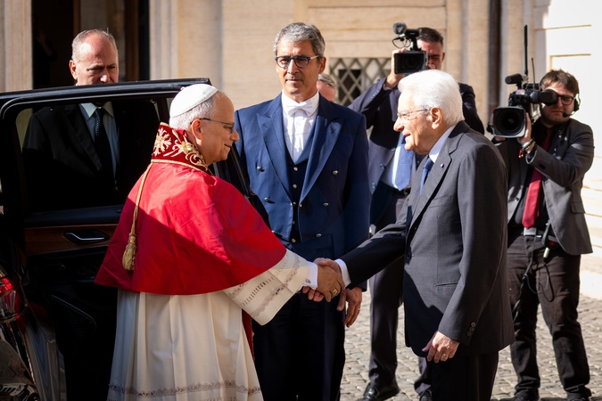 Pope Leo XIV is welcomed by Italian President Sergio Mattarella as he arrives at the Quirinale Presidential Palace in Rome, Italy, on 14 October, 2025.