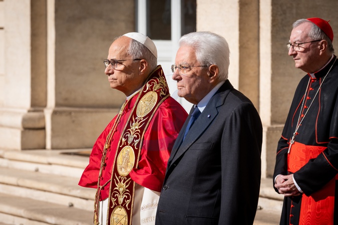 Pope Leo XIV is welcomed by Italian President Sergio Mattarella as he arrives at the Quirinale Presidential Palace in Rome, Italy, on 14 October, 2025.