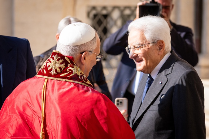 Pope Leo XIV is welcomed by Italian President Sergio Mattarella as he arrives at the Quirinale Presidential Palace in Rome, Italy, on 14 October, 2025.