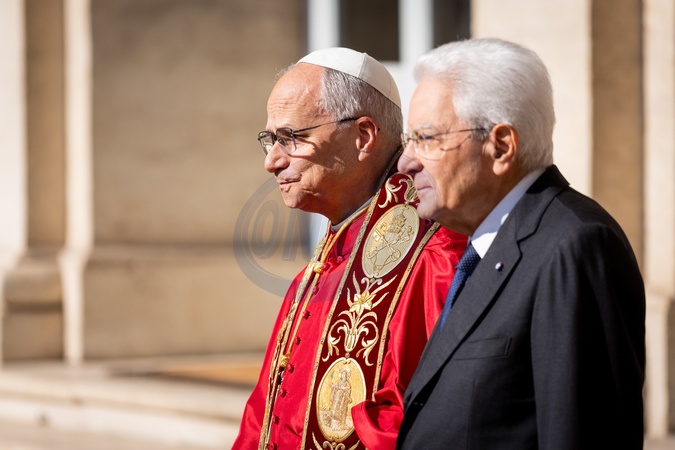 Pope Leo XIV is welcomed by Italian President Sergio Mattarella as he arrives at the Quirinale Presidential Palace in Rome, Italy, on 14 October, 2025.