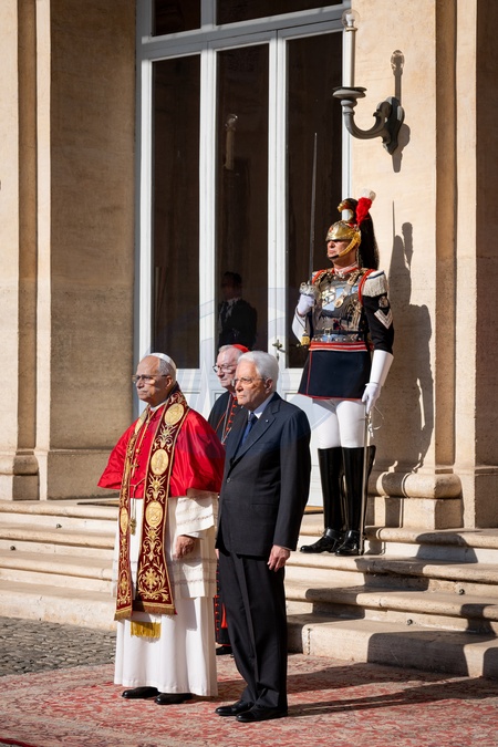 Pope Leo XIV is welcomed by Italian President Sergio Mattarella as he arrives at the Quirinale Presidential Palace in Rome, Italy, on 14 October, 2025.