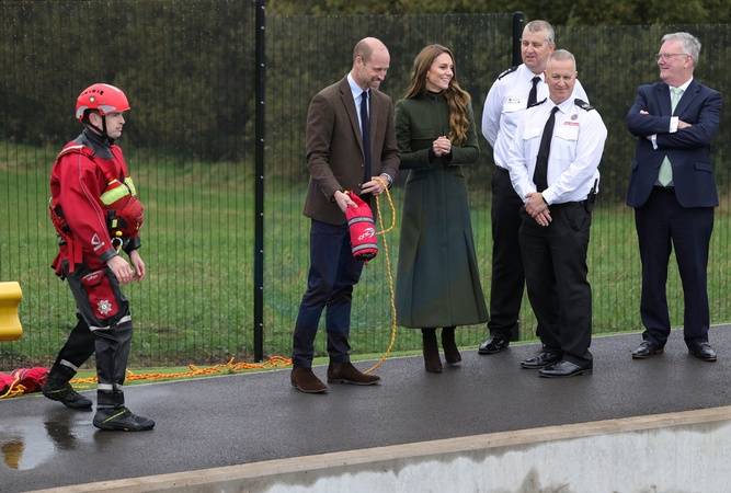 14/10/2025. Cookstown, UK. The Prince and Princess of Wales during a visit to the Northern Ireland Fire and Rescue Service Learning and Development College in Cookstown, Northern Ireland. The Prince and Princess met with Chief Fire & Rescue Officer, Aidan Jennings and learned how the college equips trainees with the skills, resilience and expertise needed to help keep everyone in Northern Ireland safe. Their Royal Highnesses then engaged with two training scenarios: a warehouse space where there was a variety of simulated incidents and drills ongoing, and the flood-water rescue training space to see a simulation of a casualty being rescued from a fast-flowing river. During these scenarios, The Prince and Princess met some of the young, trainee firefighters, as well as those who have already graduated., Credit:Pete Maclaine / Avalon
