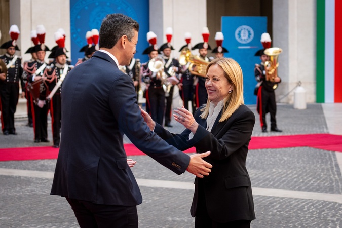 Italian Prime Minister Giorgia Meloni receives the President of Paraguay, Santiago Peña Palacios at Palazzo Chigi in Rome, Italy on 14 October 2025.