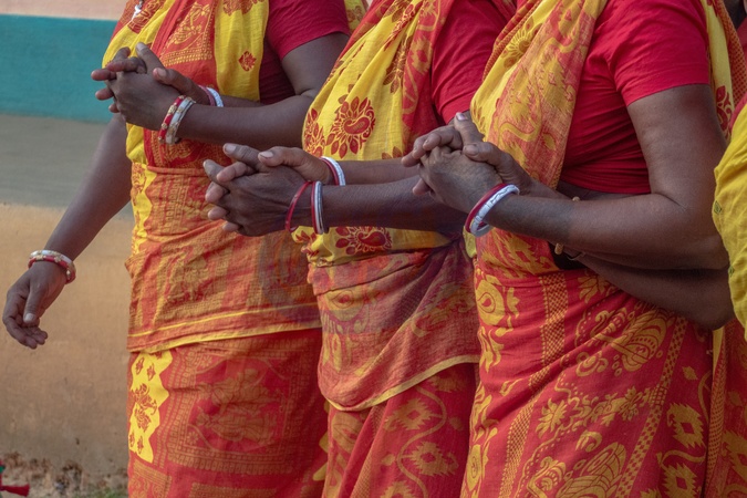 Tribal rural women performing a folk dance hand-in-hand, showcasing community unity and cultural heritage., Credit:Yousuf Sarfaraz / Avalon