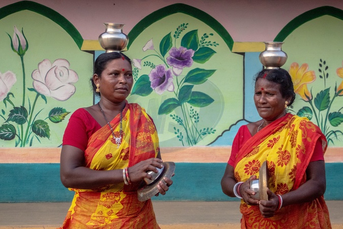 Two tribal rural women seen performing a folk dance with utensils during a village cultural program., Credit:Yousuf Sarfaraz / Avalon