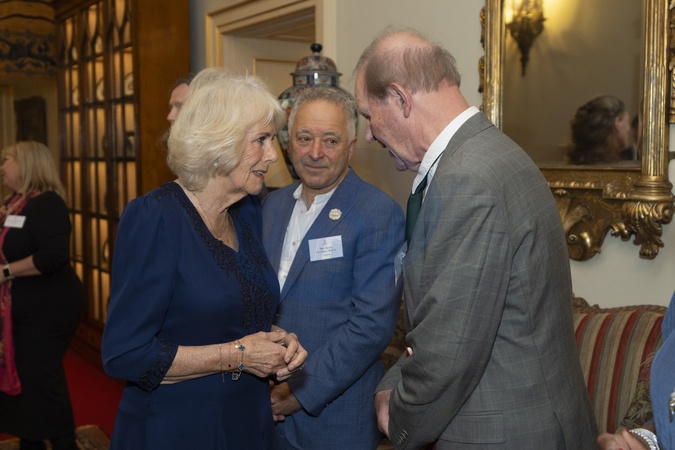 Queen Camilla with Frank Cottrell-Boyce and Sir Michael Morpurgo during a reception to celebrate the centenary of BookTrust, at Clarence House, London. Picture date: Tuesday October 14, 2025., Credit:Aaron Chown / Avalon