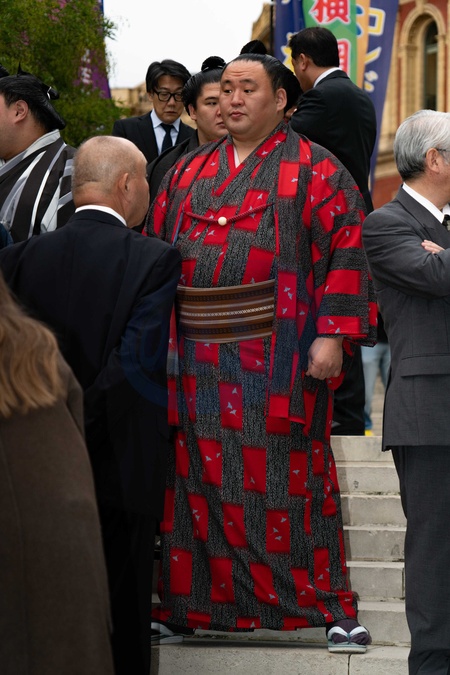 The rikishi participating in The Grand Sumo Tournament, alongside representatives from the Japan Sumo Association (Sumo Kyokai), are photographed outside the Royal Albert Hall ahead of the tournament commencing this evening. The Grand Sumo Tournament takes place at the Royal Albert Hall between 15–19 October 2025, marking only the second time Japan's iconic sport has visited the UK, following the previous event in 1991. Shot in London, UK, on 15th October 2025., Credit:Oleksii Ovcharenko / Avalon