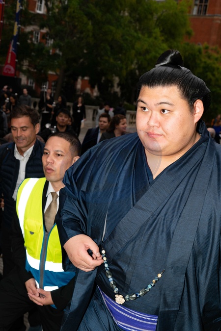 The rikishi participating in The Grand Sumo Tournament, alongside representatives from the Japan Sumo Association (Sumo Kyokai), are photographed outside the Royal Albert Hall ahead of the tournament commencing this evening. The Grand Sumo Tournament takes place at the Royal Albert Hall between 15–19 October 2025, marking only the second time Japan's iconic sport has visited the UK, following the previous event in 1991. Shot in London, UK, on 15th October 2025., Credit:Oleksii Ovcharenko / Avalon
