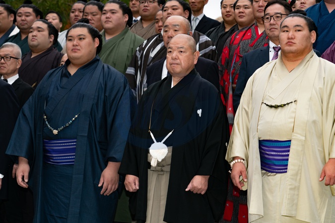 The rikishi participating in The Grand Sumo Tournament, alongside representatives from the Japan Sumo Association (Sumo Kyokai), are photographed outside the Royal Albert Hall ahead of the tournament commencing this evening. The Grand Sumo Tournament takes place at the Royal Albert Hall between 15–19 October 2025, marking only the second time Japan's iconic sport has visited the UK, following the previous event in 1991. Shot in London, UK, on 15th October 2025., Credit:Oleksii Ovcharenko / Avalon
