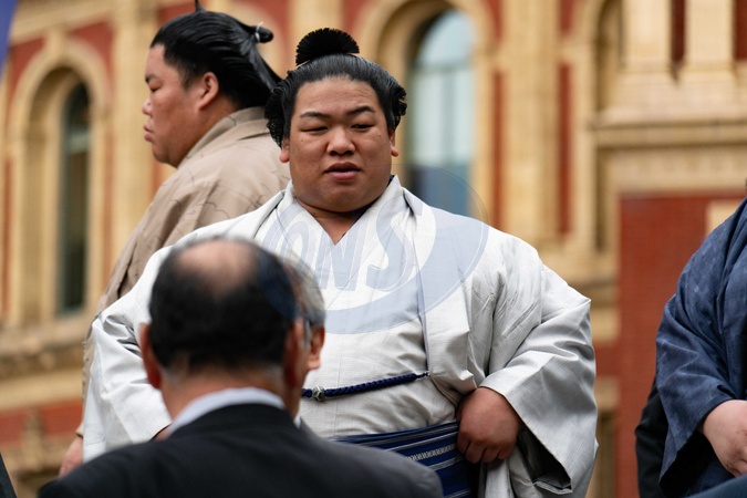 The rikishi participating in The Grand Sumo Tournament, alongside representatives from the Japan Sumo Association (Sumo Kyokai), are photographed outside the Royal Albert Hall ahead of the tournament commencing this evening. The Grand Sumo Tournament takes place at the Royal Albert Hall between 15–19 October 2025, marking only the second time Japan's iconic sport has visited the UK, following the previous event in 1991. Shot in London, UK, on 15th October 2025., Credit:Oleksii Ovcharenko / Avalon