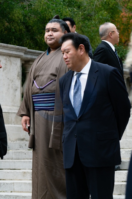 The rikishi participating in The Grand Sumo Tournament, alongside representatives from the Japan Sumo Association (Sumo Kyokai), are photographed outside the Royal Albert Hall ahead of the tournament commencing this evening. The Grand Sumo Tournament takes place at the Royal Albert Hall between 15–19 October 2025, marking only the second time Japan's iconic sport has visited the UK, following the previous event in 1991. Shot in London, UK, on 15th October 2025., Credit:Oleksii Ovcharenko / Avalon