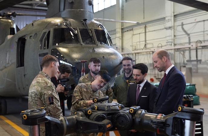 The Prince of Wales (right) and the Crown Prince Hussein of Jordan (2nd right) meet maintenance crew from No. 28 (AC) Sqn during a visit to RAF Benson in Wallingford, Oxfordshire. Picture date: Wednesday October 15, 2025., Credit:Andrew Matthews / Avalon