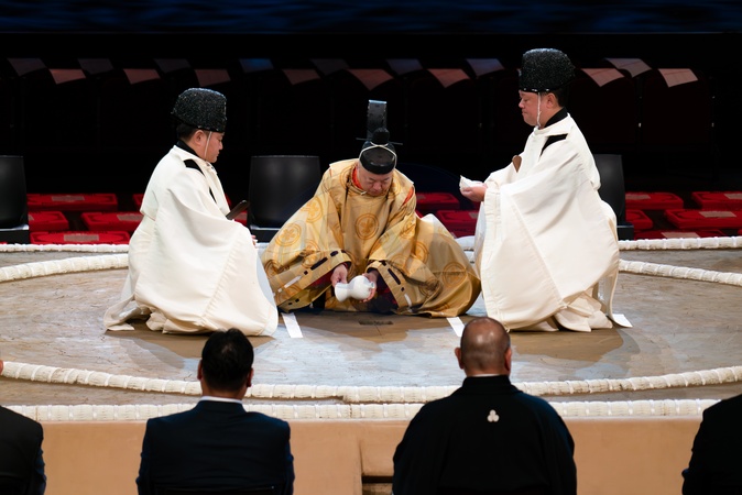 Dohyō-Matsuri (ring blessing ceremony) in the auditorium of the Royal Albert Hall ahead of the tournament commencing this evening. The Grand Sumo Tournament takes place at the Royal Albert Hall between 15–19 October 2025, marking only the second time Japa