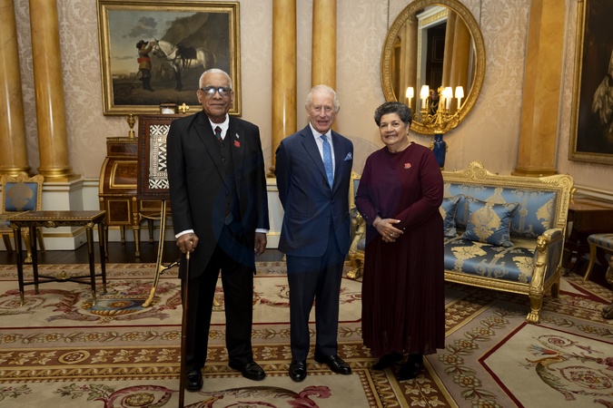 King Charles III with President of Fiji Naiqama Lalabalavu and Madam Emily Lalabalavu after an audience at Buckingham Palace, London. Picture date: Wednesday October 15, 2025., Credit:Avalon.red / Avalon
