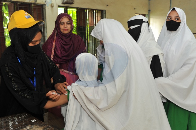 Chattogram, Bangladesh: A student is vaccinated against typhoid at Rahmania High School in the city's Hamzar Bagh area. For the first time, Bangladesh has launched a nationwide, government-run typhoid vaccination program, which began on October 12. The campaign aims to immunize about 49 million children and adolescents aged 9 months to 15 years, free of charge, against typhoid., Credit:Md Rafayat Haque Khan / Avalon