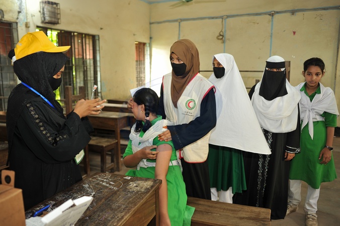 Chattogram, Bangladesh: A student is vaccinated against typhoid at Rahmania High School in the city's Hamzar Bagh area. For the first time, Bangladesh has launched a nationwide, government-run typhoid vaccination program, which began on October 12. The campaign aims to immunize about 49 million children and adolescents aged 9 months to 15 years, free of charge, against typhoid., Credit:Md Rafayat Haque Khan / Avalon
