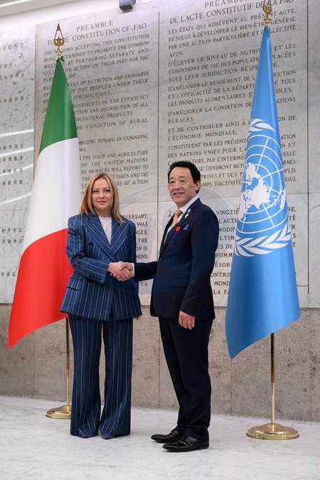 FAO Director General QU Dongyu , italian prime minister Giorgia Meloni during FAO Assembly on the occasion of World Food Day and the 80th anniversary of its foundation, Rome, Italy 16 Oct 2025, Credit:Maria Laura Antonelli / Avalon