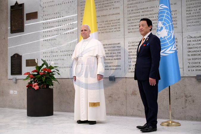 FAO Director General QU Dongyu , Pope Leo XIV during FAO Assembly on the occasion of World Food Day and the 80th anniversary of its foundation, Rome, Italy 16 Oct 2025, Credit:Maria Laura Antonelli / Avalon