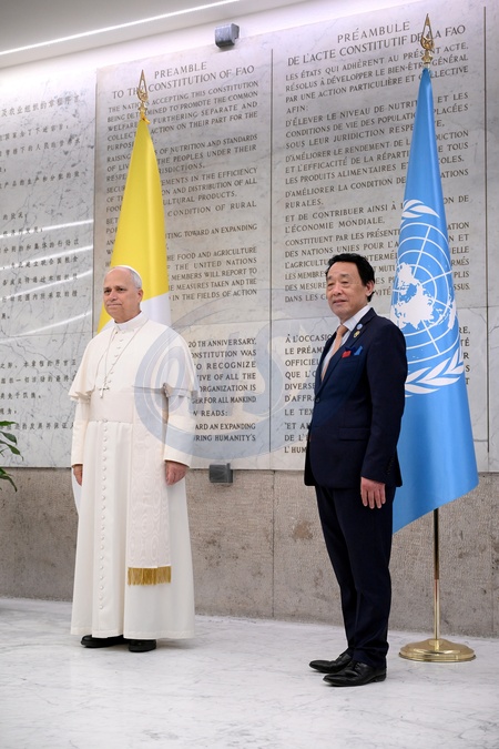 FAO Director General QU Dongyu , Pope Leo XIV during FAO Assembly on the occasion of World Food Day and the 80th anniversary of its foundation, Rome, Italy 16 Oct 2025, Credit:Maria Laura Antonelli / Avalon