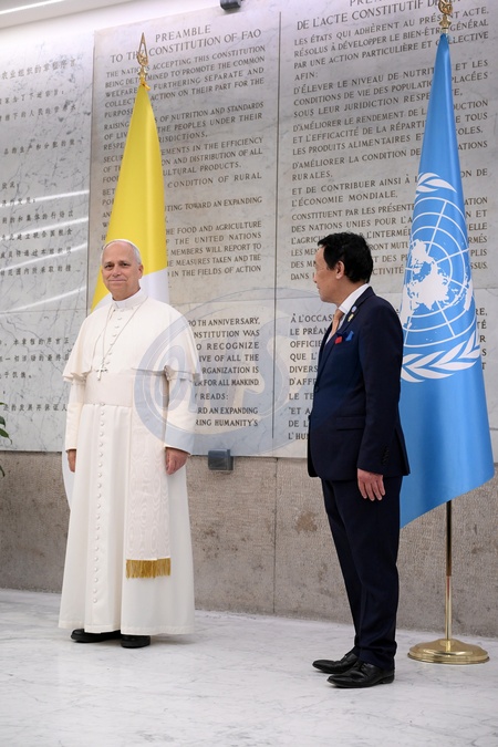 FAO Director General QU Dongyu , Pope Leo XIV during FAO Assembly on the occasion of World Food Day and the 80th anniversary of its foundation, Rome, Italy 16 Oct 2025, Credit:Maria Laura Antonelli / Avalon