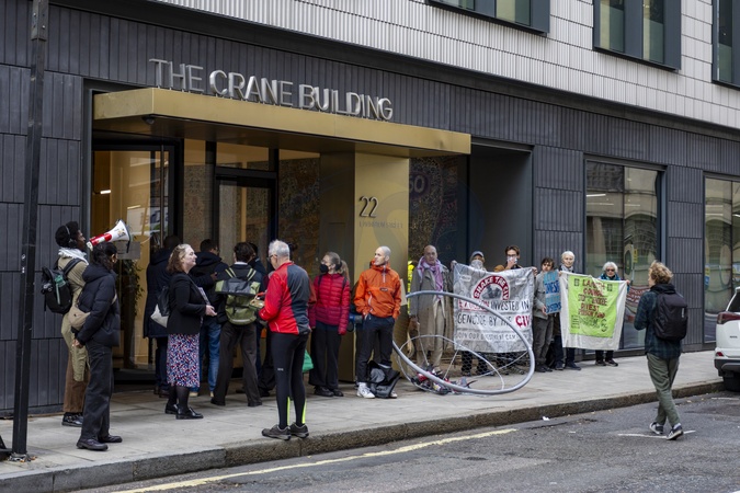 Protesters gathered outside the London Collective Investment Vehicle (LCIV) offices in Central London, calling for the organisation to divest pensions and investments from companies linked to Israel. Demonstrators held placards and banners urging financial accountability and solidarity with Palestinians, demanding that public funds not be used to support the occupation., Credit:Zak Irfan / Avalon
