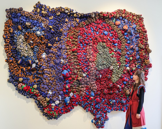 London, UK. 16th Oct 2025. Staff with a vibrant piece made from recycled African fabrics and other materials, outlining an African country, Affinity Art Gallery, Lagos, Nigeria (work title and artist not available at time of photocall). 1-54 is the leading global platform for contemporary and modern art from Africa and its diaspora, with many leading galleries and artists present. It draws reference to the 54 countries that constitute the African continent., Credit:Imageplotter / Avalon