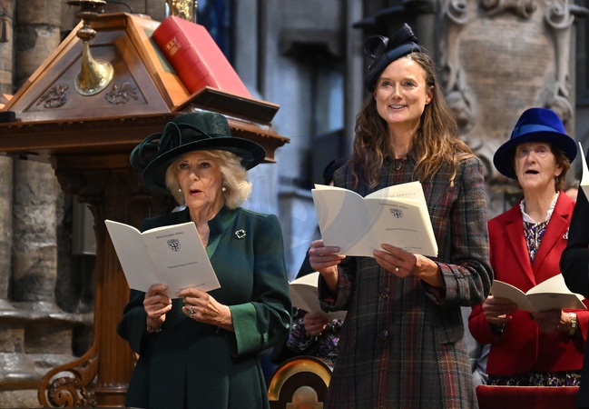 Britain's Queen Camilla attends the National Harvest Festival Service, at Westminster Abbey in London on October 16, 2025.