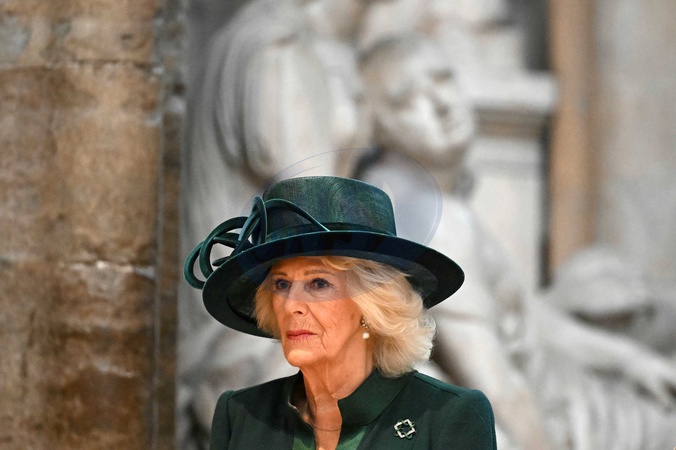 Britain's Queen Camilla attends the National Harvest Festival Service, at Westminster Abbey in London on October 16, 2025.