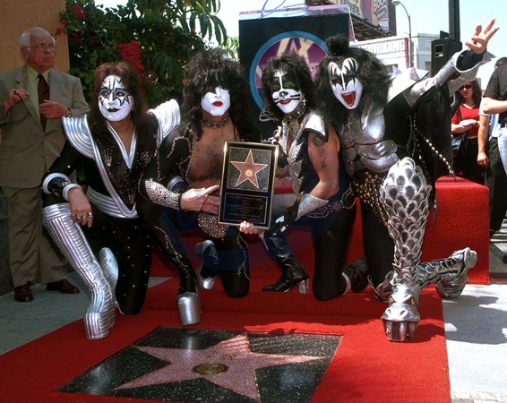 REFERENCE: LAP99081114 - 11 AUGUST 1999 - LOS ANGELES, CALIFORNIA, USA: Member of the rock group KISS, Ace Frehley, Paul Stanley, Peter Criss and Gene Simmons, left to right, strike a pose for photographers following a ceremony August 11 honoring them wit
