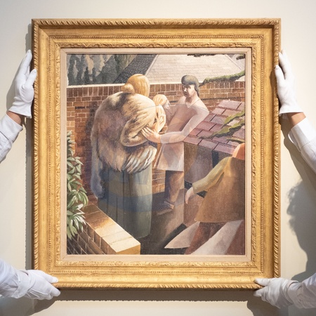 A staff member views 'The Meeting' by Sir Stanley Spencer (est. £1.2m - £1.8m) at Christie's 'Modern British and Irish Art Evening Sale' which is to go on auction on 22nd and 23rd October 2025 - Christie's King Street, London, England, UK on Friday 17 October, 2025., Credit:Justin Ng / Avalon