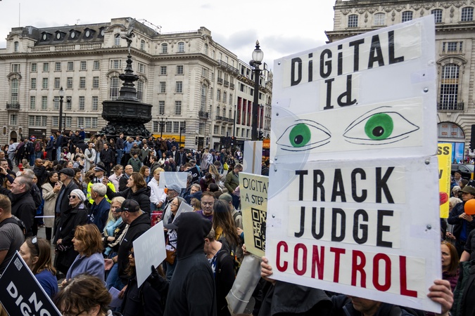 Protesters gathered at Marble Arch in Central London to oppose the UK government's proposed rollout of Digital IDs. Demonstrators voiced strong concerns about privacy, surveillance, and the erosion of personal freedoms. After the initial rally, activists marched from Marble Arch to 10 Downing Street, chanting slogans and holding placards demanding the protection of digital rights and civil liberties. The protest drew campaigners, privacy advocates, and concerned citizens united in their opposition to government overreach., Credit:Zak Irfan / Avalon