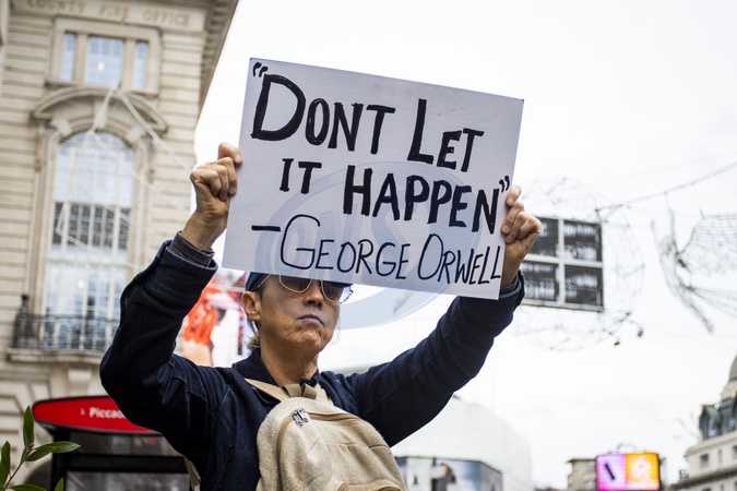 Protesters gathered at Marble Arch in Central London to oppose the UK government's proposed rollout of Digital IDs. Demonstrators voiced strong concerns about privacy, surveillance, and the erosion of personal freedoms. After the initial rally, activists marched from Marble Arch to 10 Downing Street, chanting slogans and holding placards demanding the protection of digital rights and civil liberties. The protest drew campaigners, privacy advocates, and concerned citizens united in their opposition to government overreach., Credit:Zak Irfan / Avalon