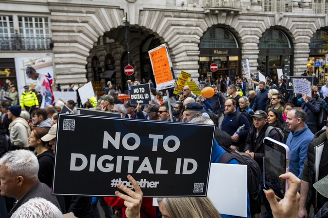 Protesters gathered at Marble Arch in Central London to oppose the UK government's proposed rollout of Digital IDs. Demonstrators voiced strong concerns about privacy, surveillance, and the erosion of personal freedoms. After the initial rally, activists marched from Marble Arch to 10 Downing Street, chanting slogans and holding placards demanding the protection of digital rights and civil liberties. The protest drew campaigners, privacy advocates, and concerned citizens united in their opposition to government overreach., Credit:Zak Irfan / Avalon