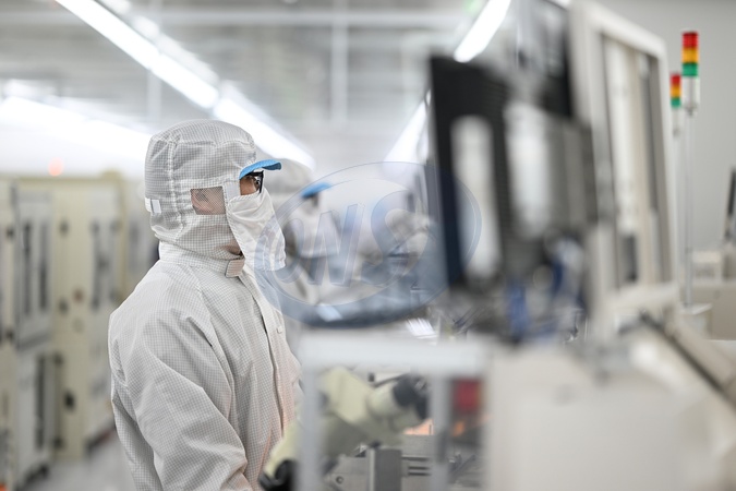 An employee works at a semiconductor chip plant in Suqian in east China's Jiangsu province Monday, Oct. 20, 2025., Credit:FANG DONGXU / Avalon