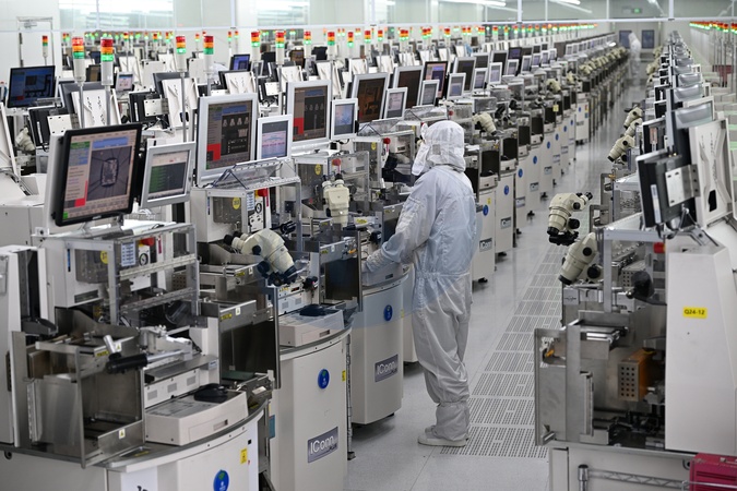 An employee works at a semiconductor chip plant in Suqian in east China's Jiangsu province Monday, Oct. 20, 2025., Credit:FANG DONGXU / Avalon