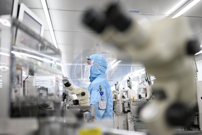An employee works at a semiconductor chip plant in Suqian in east China's Jiangsu province Monday, Oct. 20, 2025., Credit:FANG DONGXU / Avalon