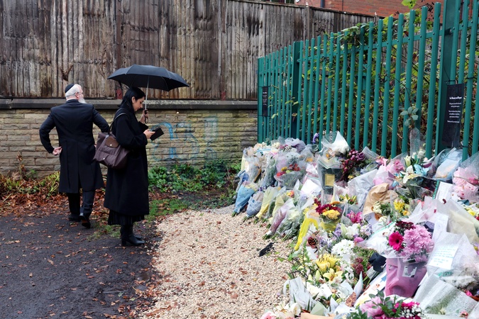 MANCHESTER, ENGLAND - OCTOBER 20: Members of the public pay their respects at the Heaton Park Hebrew Congregation Synagogue on October 20, 2025 in Manchester, England. The King is visiting Manchester to show his support for the Jewish community in the city, following the attack at Heaton Park Hebrew Congregation Synagogue on October 02., Credit:Chris Jackson / Avalon