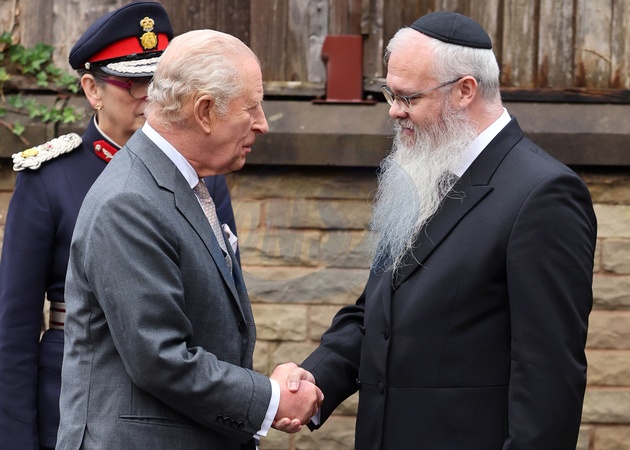 MANCHESTER, ENGLAND - OCTOBER 20: King Charles III is greeted by Rabbi Daniel Walker during a visit to Heaton Park Hebrew Congregation Synagogue on October 20, 2025 in Manchester, England. The King is visiting Manchester to show his support for the Jewish community in the city, following the attack at Heaton Park Hebrew Congregation Synagogue on October 02., Credit:Chris Jackson / Avalon
