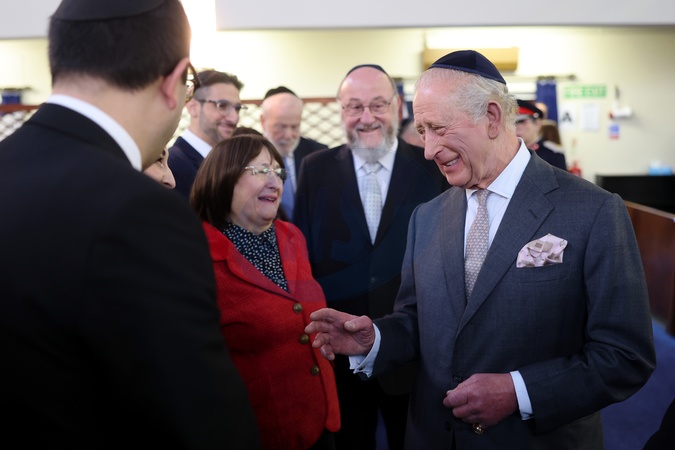 MANCHESTER, ENGLAND - OCTOBER 20: King Charles III meets members of the community during a visit to Heaton Park Hebrew Congregation Synagogue on October 20, 2025 in Manchester, England. The King is visiting Manchester to show his support for the Jewish community in the city, following the attack at Heaton Park Hebrew Congregation Synagogue on October 02., Credit:Chris Jackson / Avalon