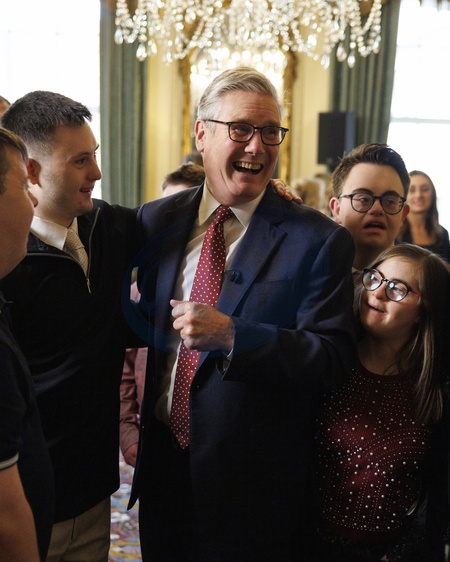 21/10/2025. London, United Kingdom. Prime Minister Keir Starmer speaks with members of the Ups and Downs theatre group as he hosts a reception for award winners and families from the Pride of Britain in 10 Downing Street., Credit:Simon Dawson / Avalon