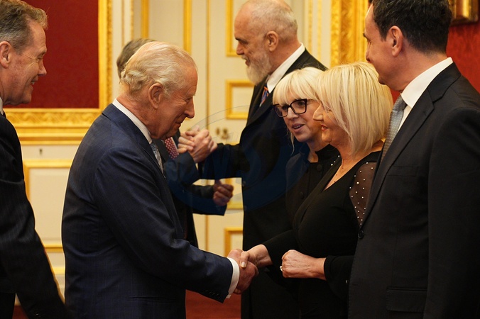 King Charles III greets Borjana Kristo chairwoman of the Council of Ministers of Bosnia and Herzegovina during a reception for Western Balkans leaders at St James's Palace, central London, on the eve of the Western Balkans Leaders' Summit. Picture date: Tuesday October 21, 2025., Credit:Aaron Chown / Avalon