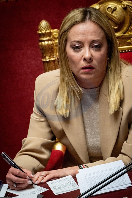Italian Prime Minister Giorgia Meloni addresses the Italian Senate ahead of the next European Council at Palazzo Madama in Rome, Italy, on 22 October 2025.